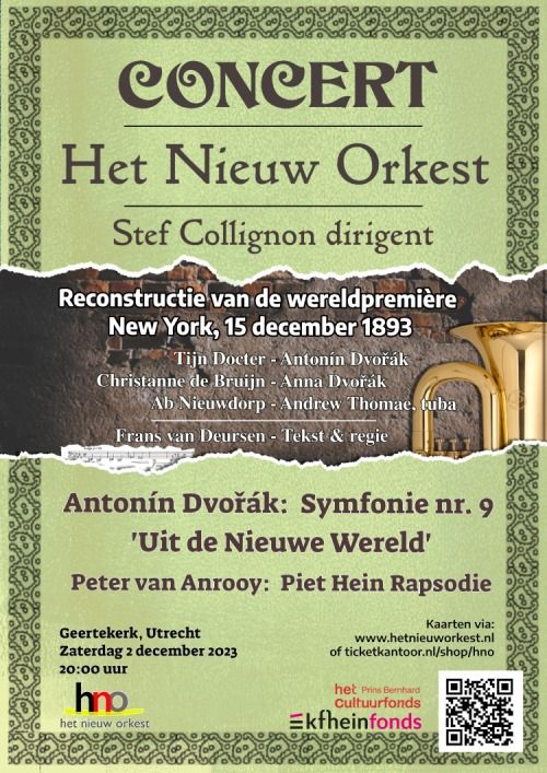 Op het programma stond de 9e Symfonie van Dvořák, ‘Uit De Nieuwe Wereld’. Maar eerst werd u, in een reconstructie van de generale repetitie voor de wereldpremière van deze beroemde symfonie, meegenomen in het verhaal tussen Antonín Dvořák, zijn vrouw Anna en tubaïst Andrew Thomae, over die eigenaardige tubapartij met slechts 7 noten. Zeven. Wat is er toch gebeurd die dag, in New York, op 15 december 1893? Het werd u verteld door acteurs Tijn Docter, Christanne de Bruijn en radiopresentator Ab Nieuwdorp op tuba, en begeleid door het orkest, dat – uiteraard – de definitieve versie van Dvořáks meesterwerk speelde. Gebaseerd op het korte verhaal ‘In De Nieuwe Wereld’ van Mitzie Klumper. Tekst en regie: Frans van Deursen. Het concert werd afgesloten met de Piet Hein Rapsodie van de Nederlander Peter van Anrooy; dit stuk werd 20 jaar na de première van de symfonie van Dvořák door hetzelfde NewYork Philharmonic in dezelfde Carnegie Hall uitgevoerd. |